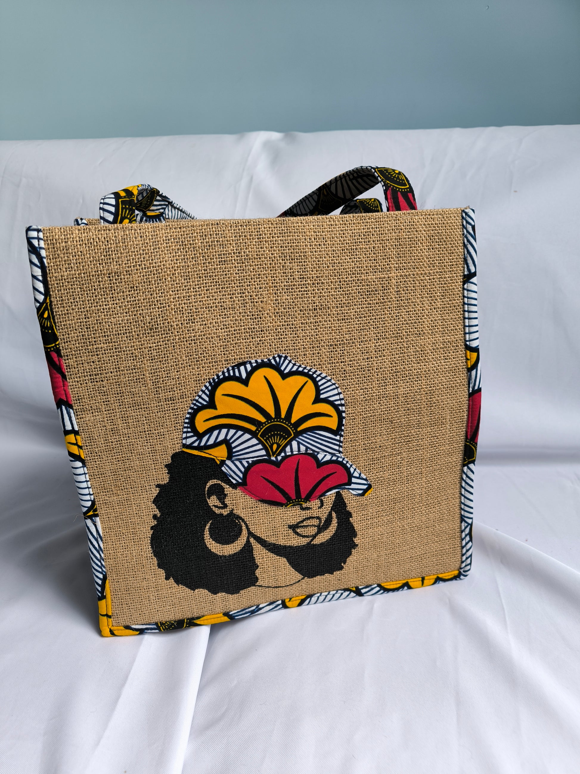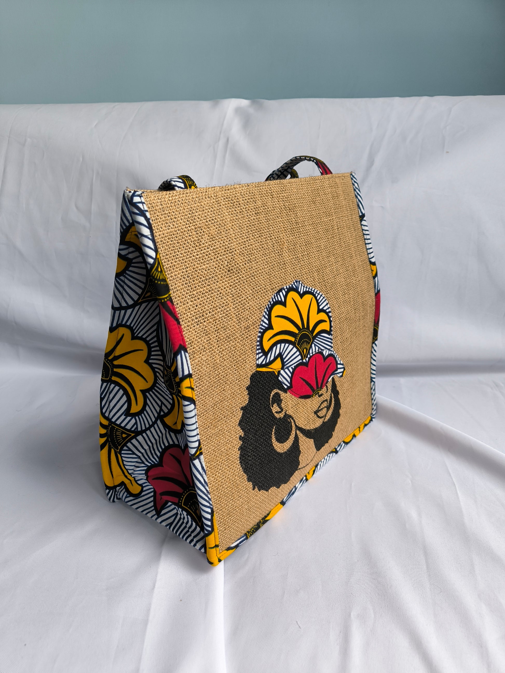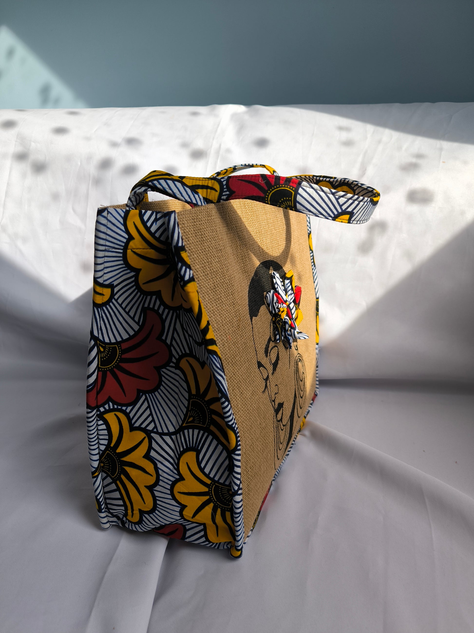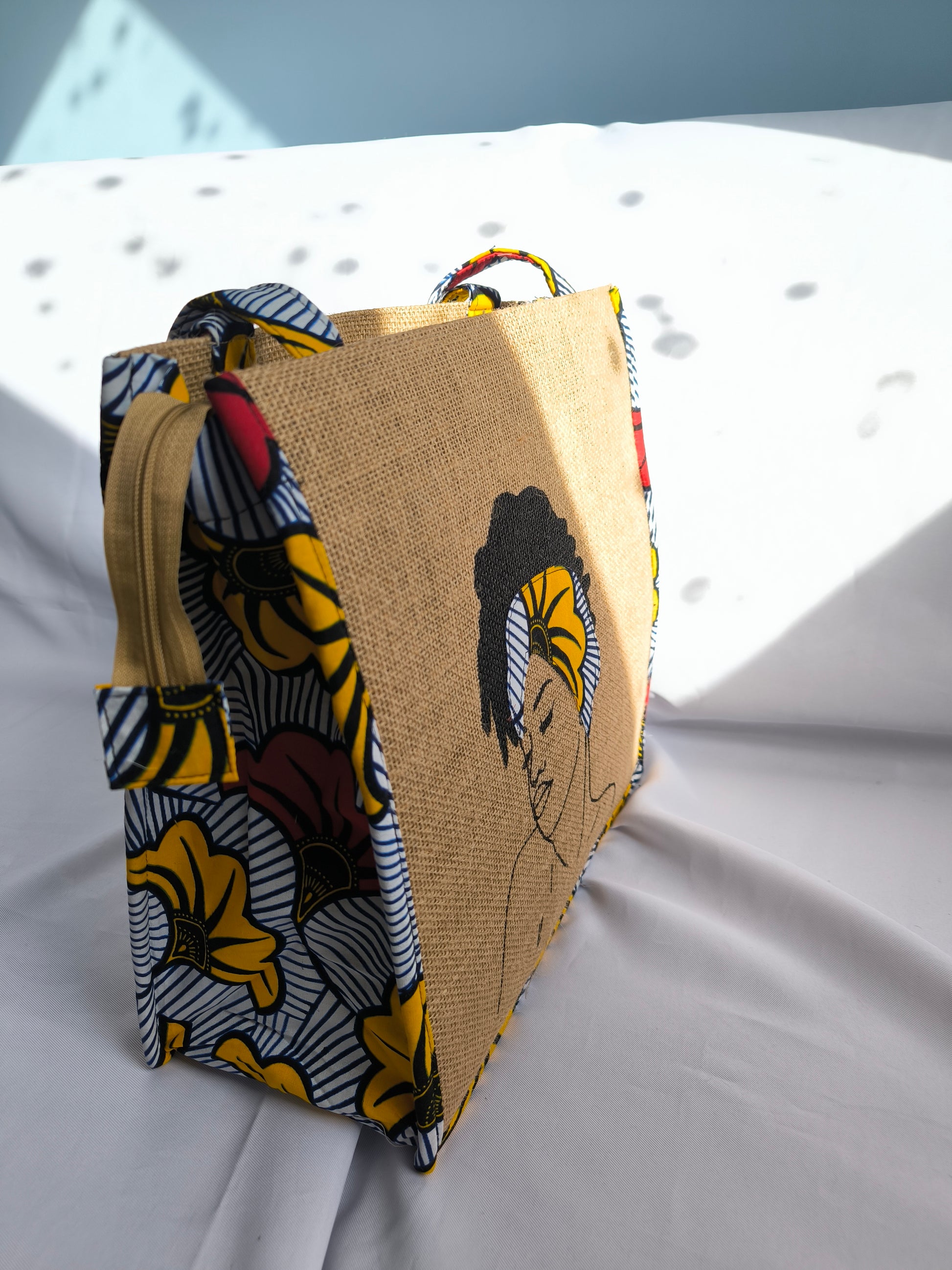 Le grand sac Wonder Queen allie jute naturelle et tissu Wax Africain pour célébrer la richesse culturelle de tous les Afro descendants.